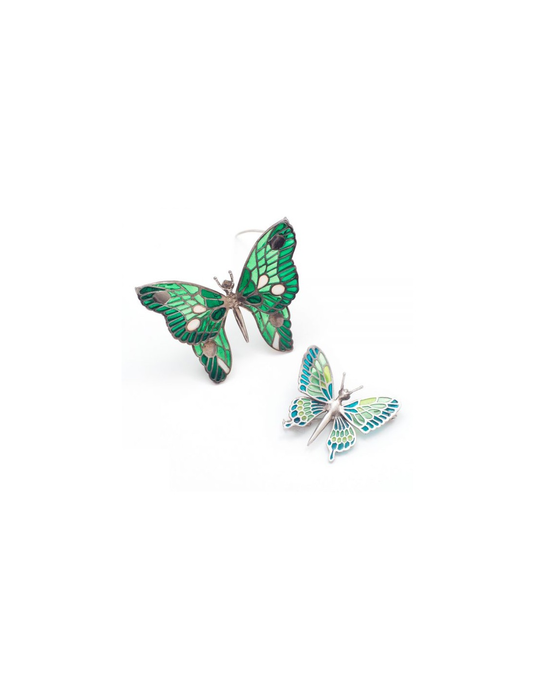 Broches mariposas en esmalte al fuego, tipo vidriera, sobre plata de ley.