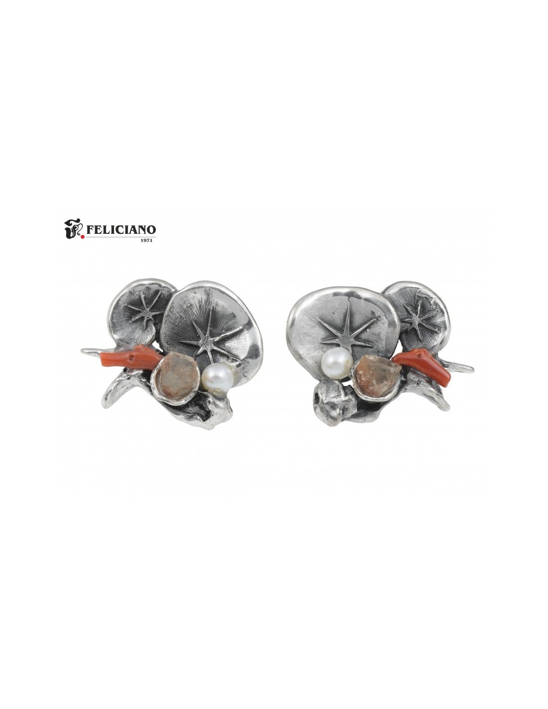 En plata de ley con cuarzos en bruto, coral y perla, cierre omega, largo 22mm ancho 22mm.
