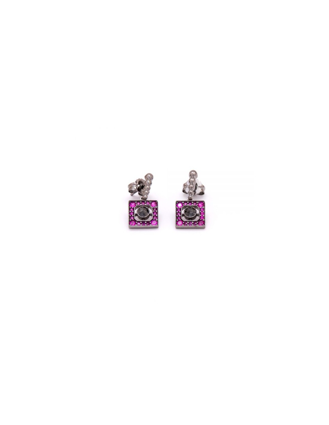Pendientes en plata de ley con baño de rutenio, zafiros rosas y brillantes negros (0,50 qts., talla y proporciones: muy buena) cierre presión.