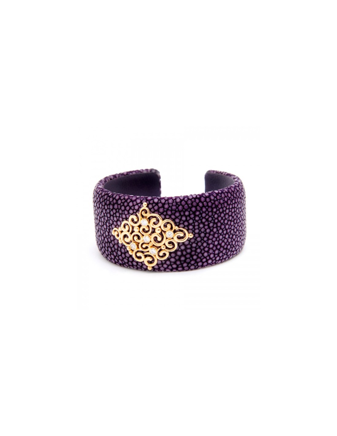 Pulsera piel manta raya con arabesco en oro rosa y brillantes.