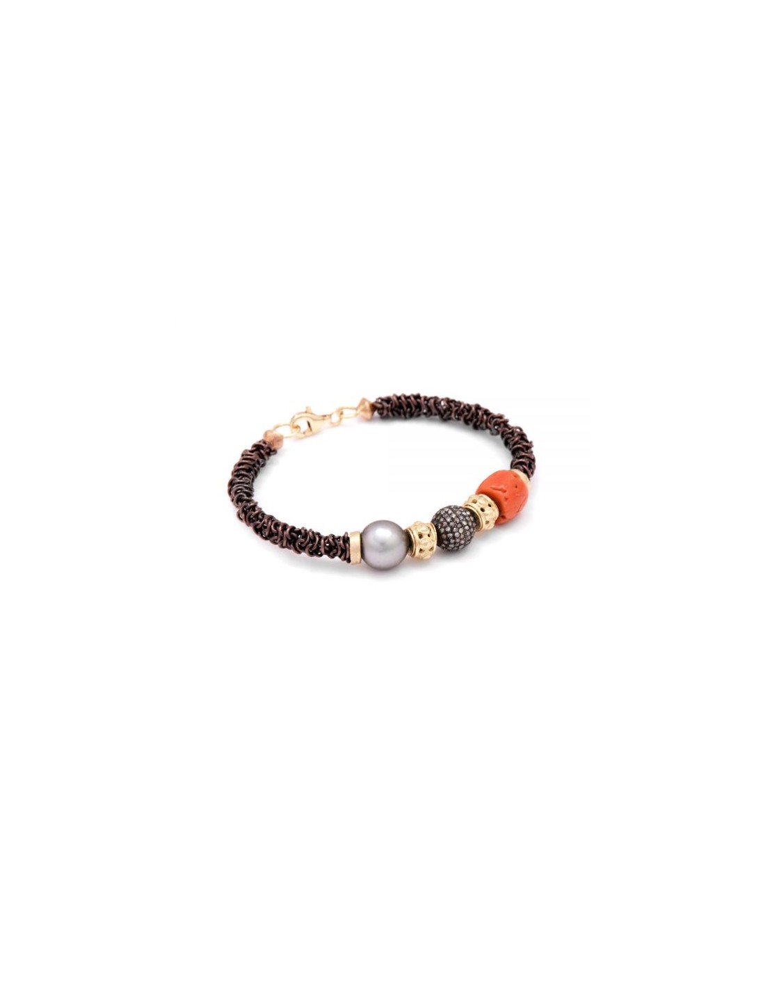 Pulsera de acero con entre piezas en oro amarillo 1ª ley, coral natural mediterráneo, perla Tahiti y bola ice (diamantes y oro).