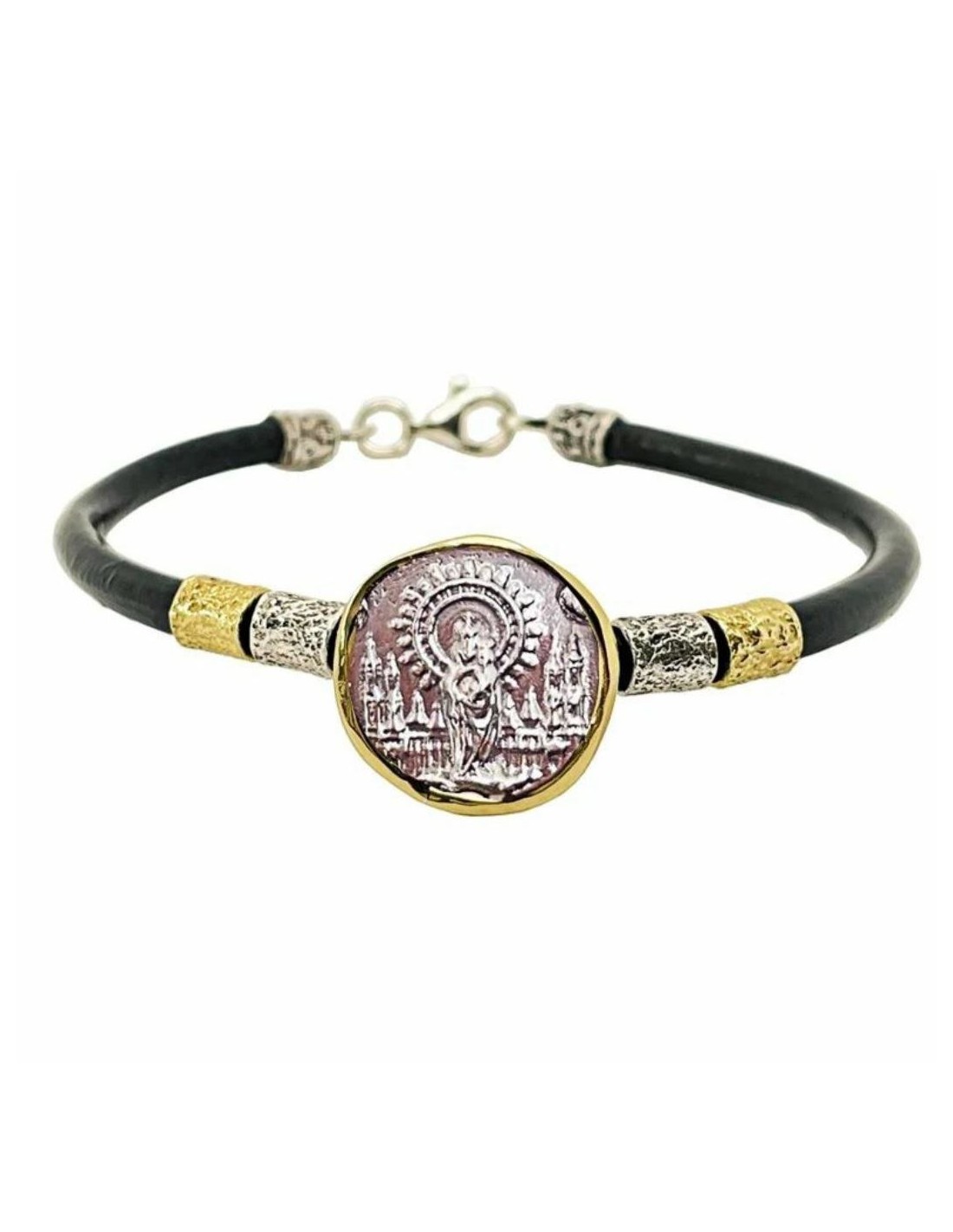 En plata de ley y bronce con cuero, cierre de mosquetón también en plata.