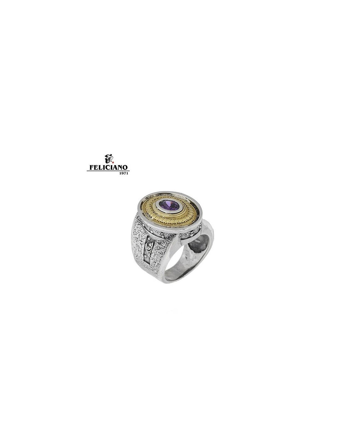 En plata de ley y bronce con detalles labrados alrededor y en el aro