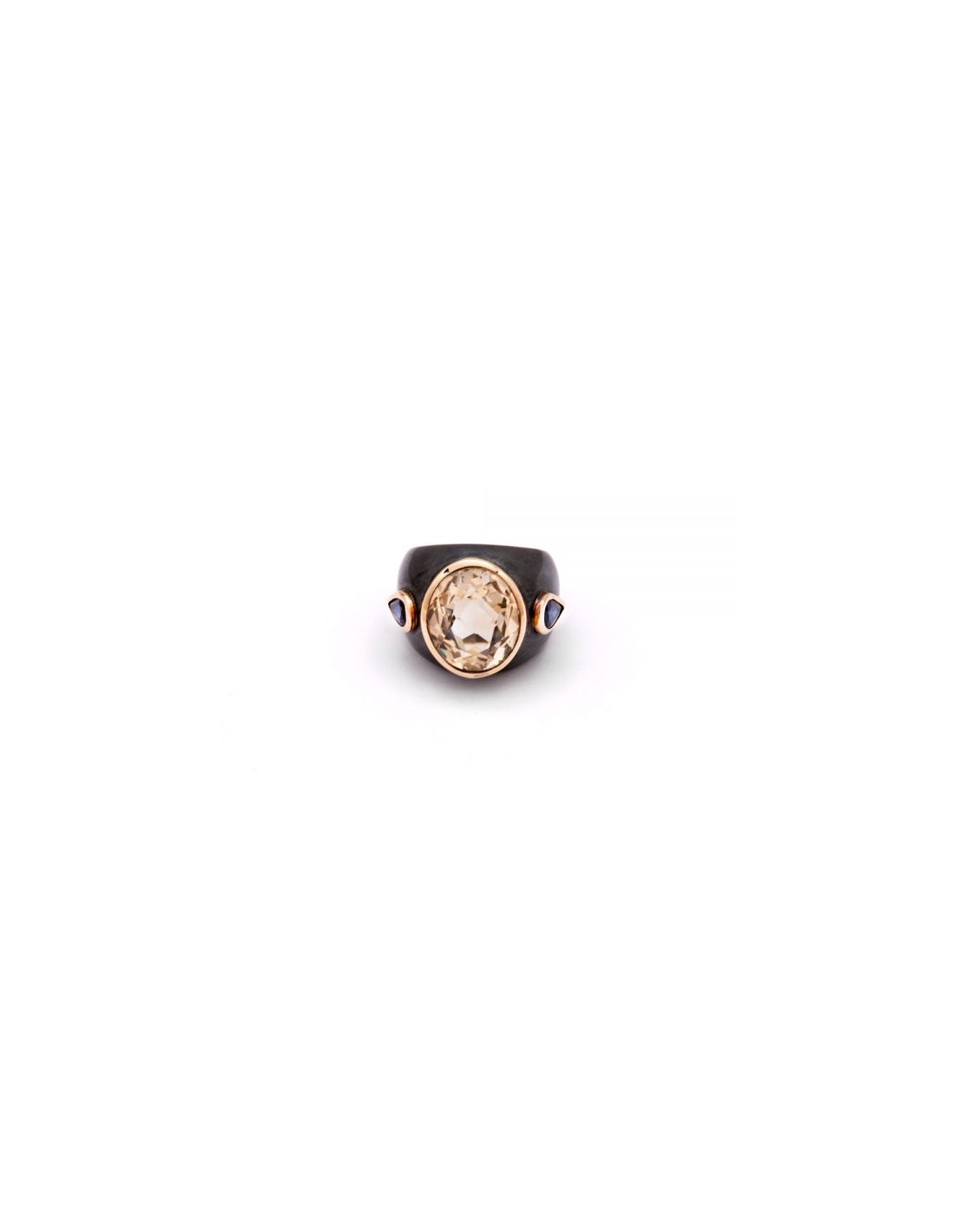 Sortija en plata de ley con cuarzo limón facetado engastado en oro y con zafiros facetados en talla pera a los laterales engastados en oro