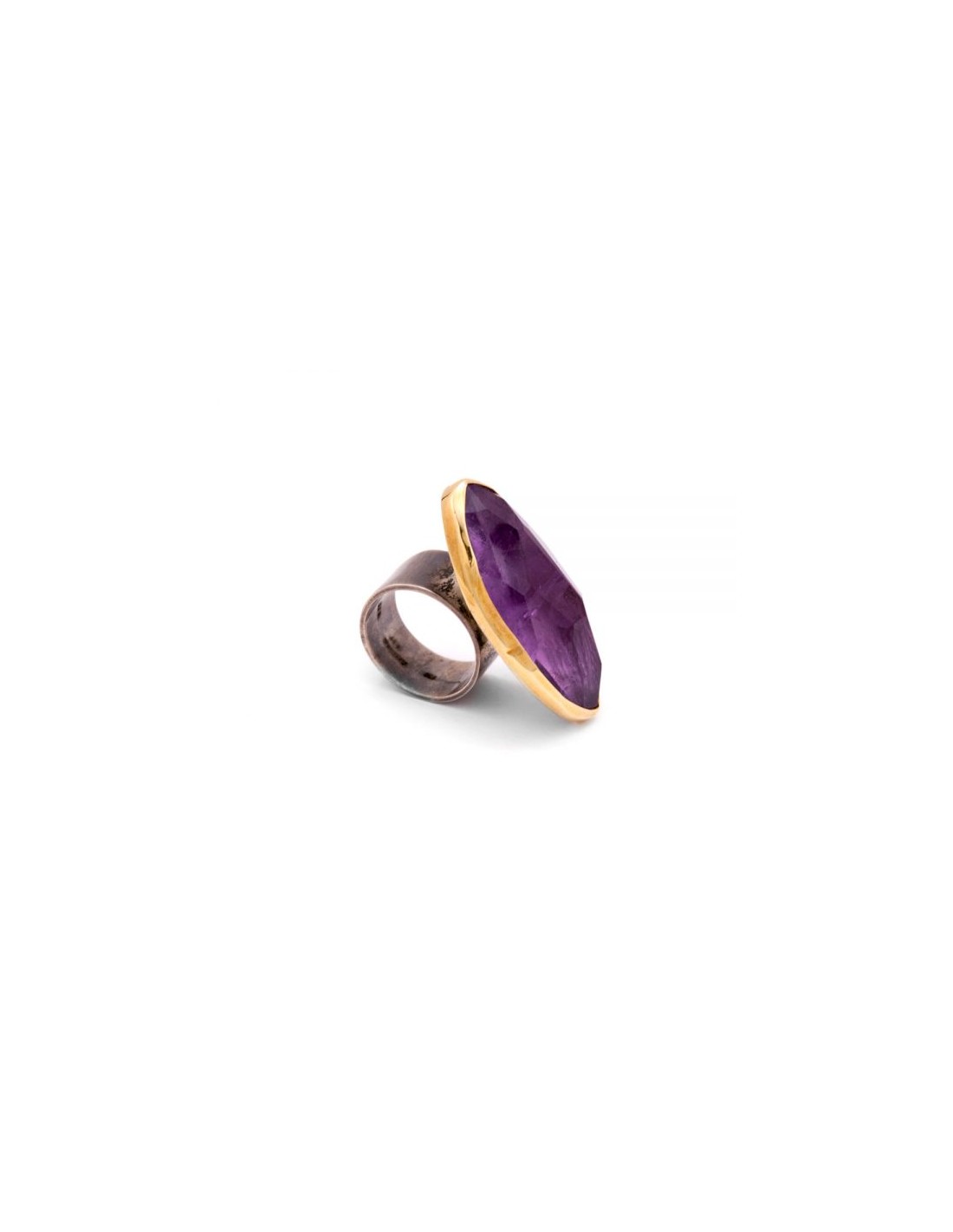Sortija plata de ley con amatista irregular facetada engastada en oro.