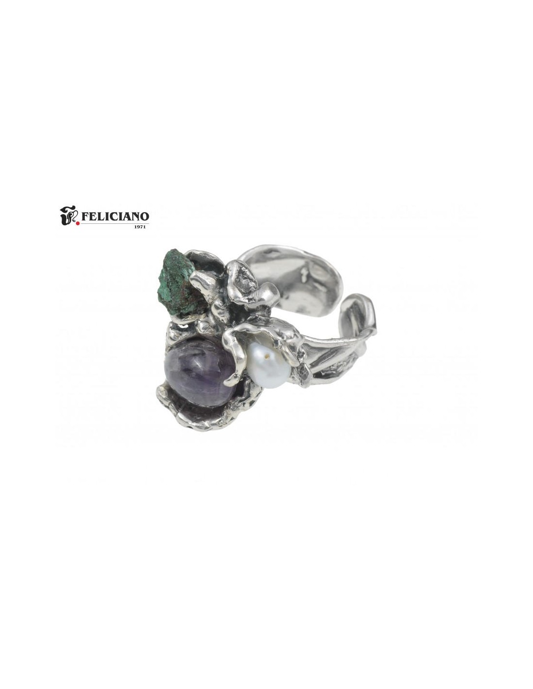 En plata de ley con perla y piedras naturales en bruto